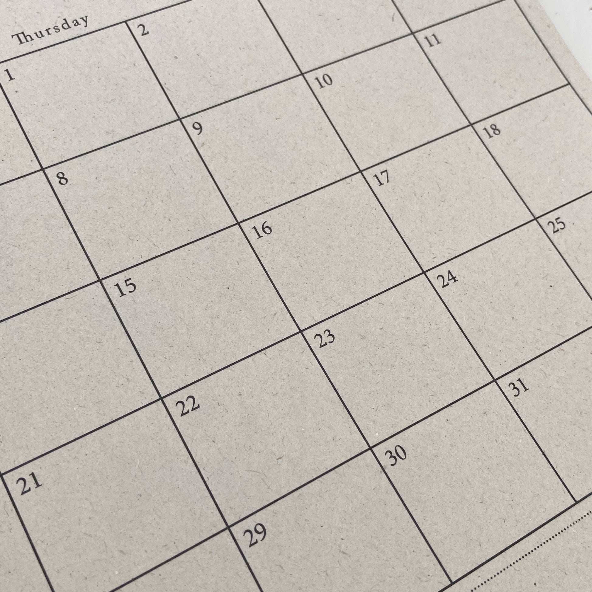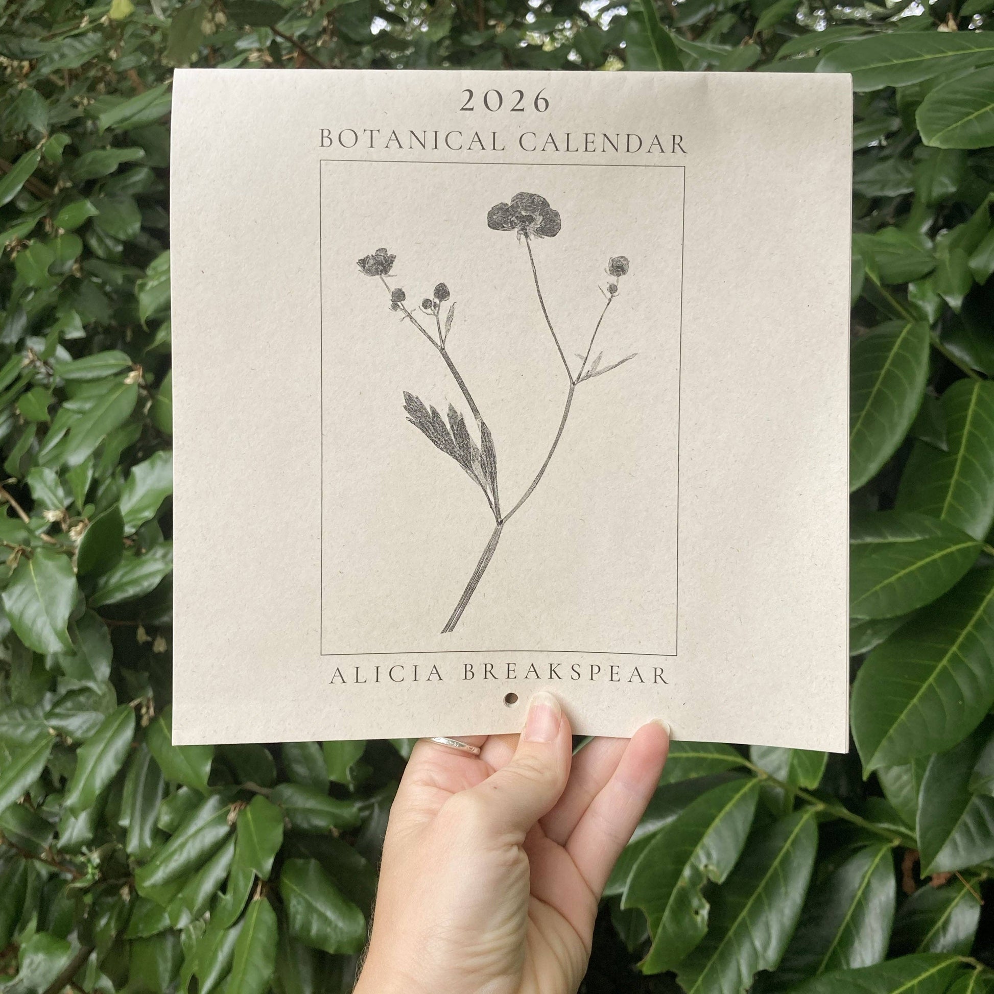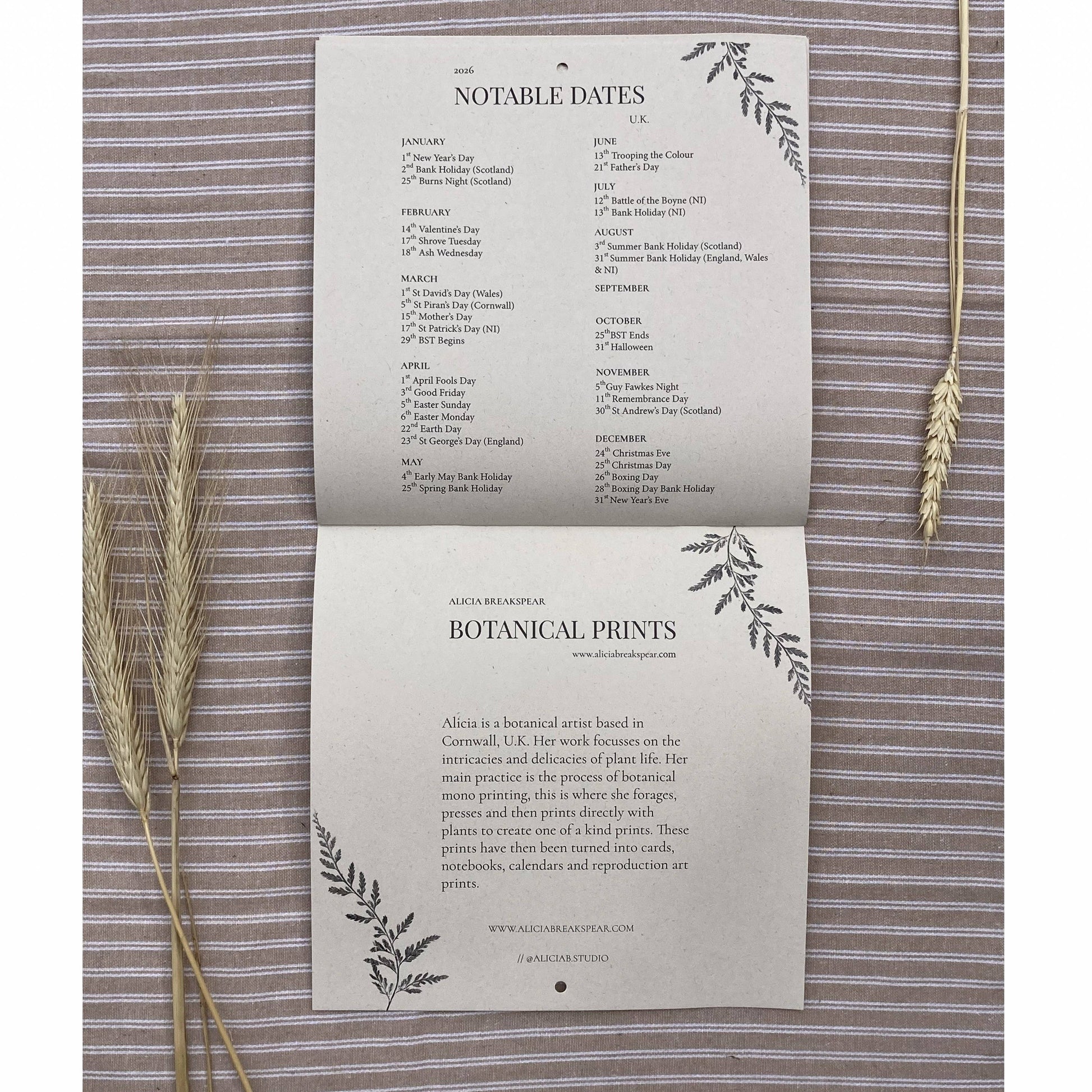 The 2026 botanical wall art calendar, created by Alicia Breakspear, showcases 12 botanical monoprints. It is printed on eco-friendly agricultural waste paper. The calendar measures 21x21cm when closed and 21x42cm when open, in a portrait layout. Each box is 3cm by 2.5cm, with some months including a text box at the bottom. Made with Oribi Straw Agricultural waste paper, the cover is 150gsm and the inner pages are 90gsm. It’s staple bound with a 5mm hole for hanging and includes a page listing notable dates and public holidays.