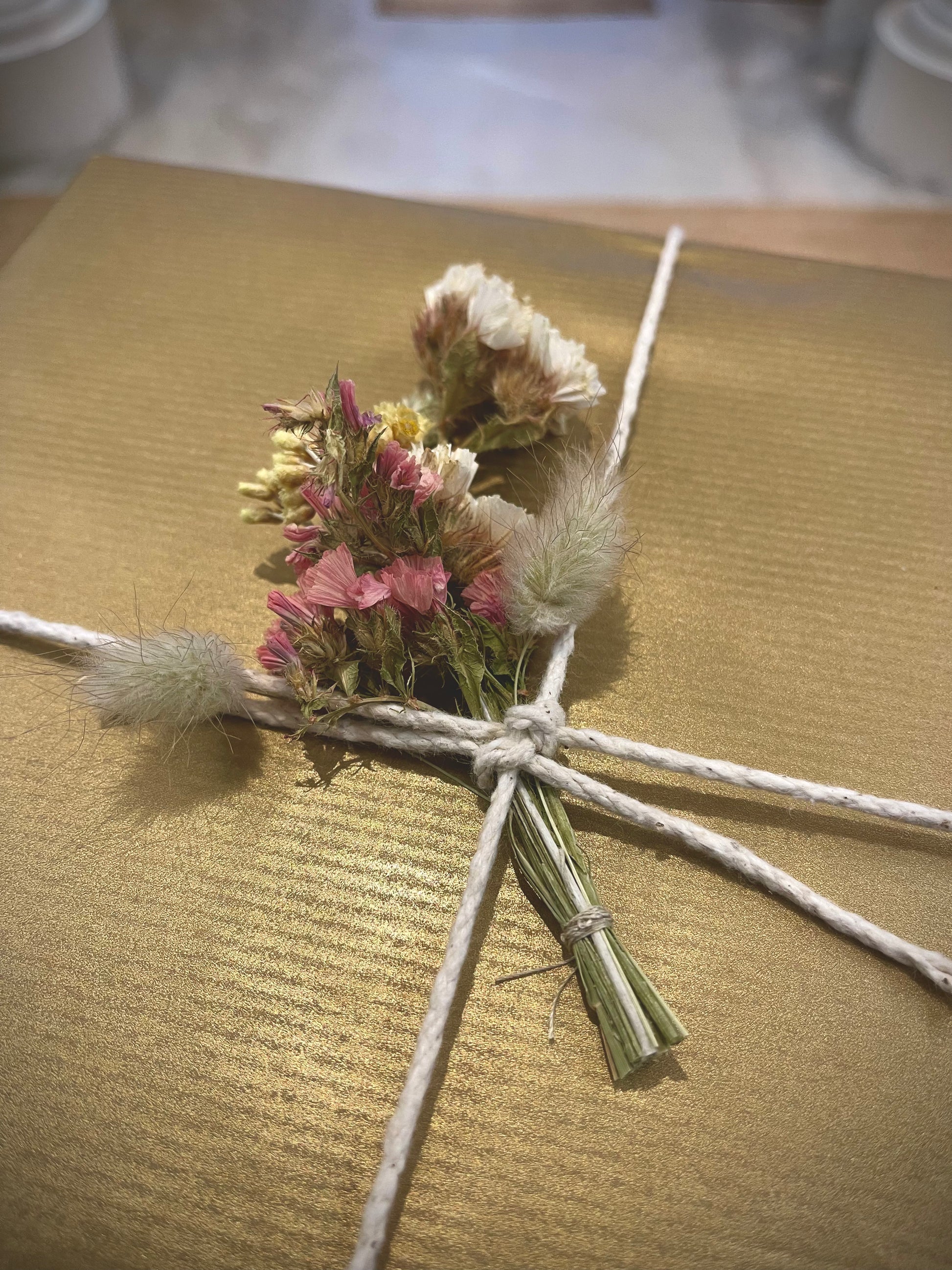 The wrapped box will be beautifully tied with some cotton twine and a small selection of seasonal dried flowers (where available).