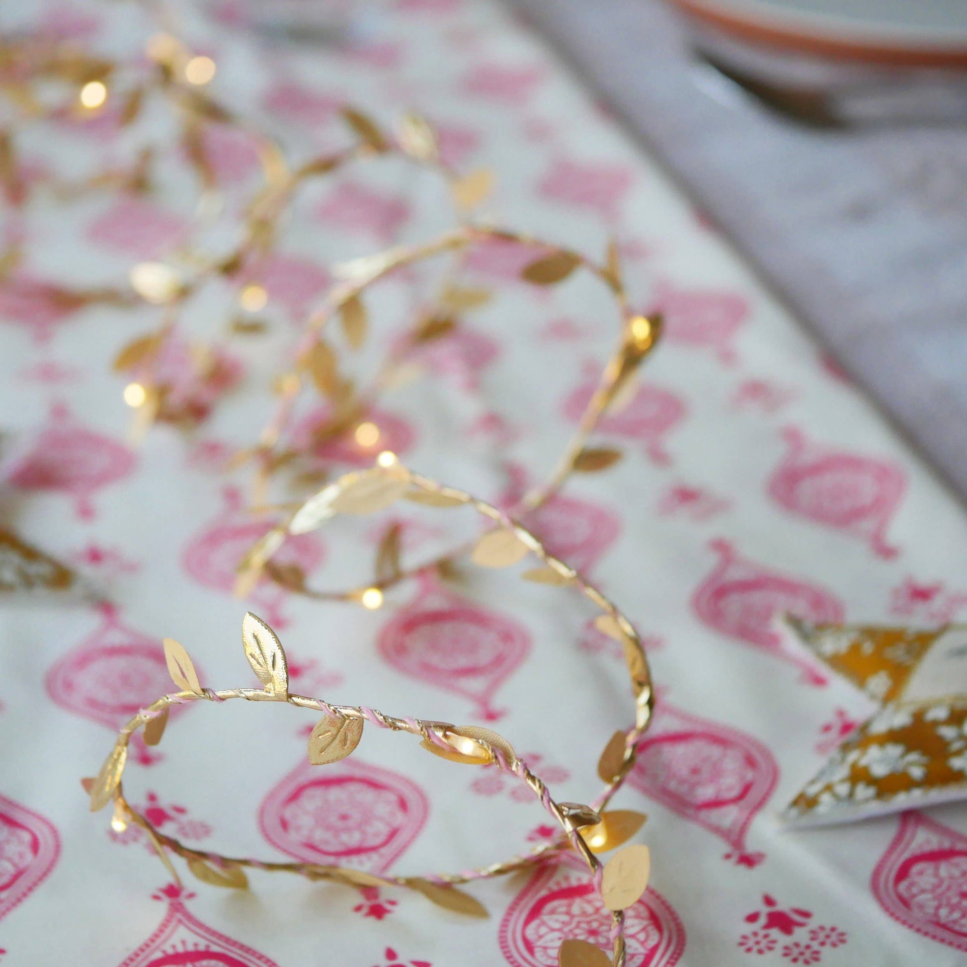 Gold Leaf Fairy Light String with warm white LEDs and delicate pink thread detailing. Battery-operated (2 x CR2032 included) and 2 metres long, perfect for creating ambient lighting year-round. Handmade gold leaves catch light beautifully whether switched on or off. Ideal for Christmas, weddings, or everyday décor. High-quality LEDs deliver lasting brightness. Indoor use only. Comes in recyclable packaging.