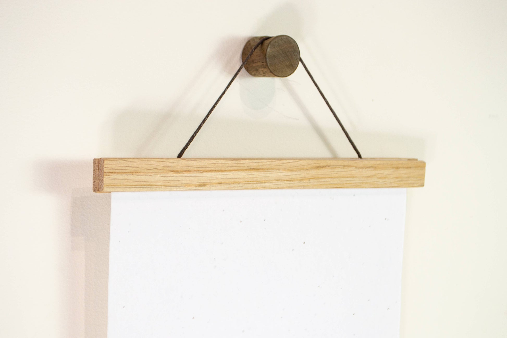 This high-quality Magnetic Poster Wall Hanger features a solid oak wood frame with a durable waxed cord hanging string. The powerful magnets are capable of securely displaying posters, prints, and other wall hangings, even heavier than standard sizes. Designed to accommodate paper sizes A4 and A3.